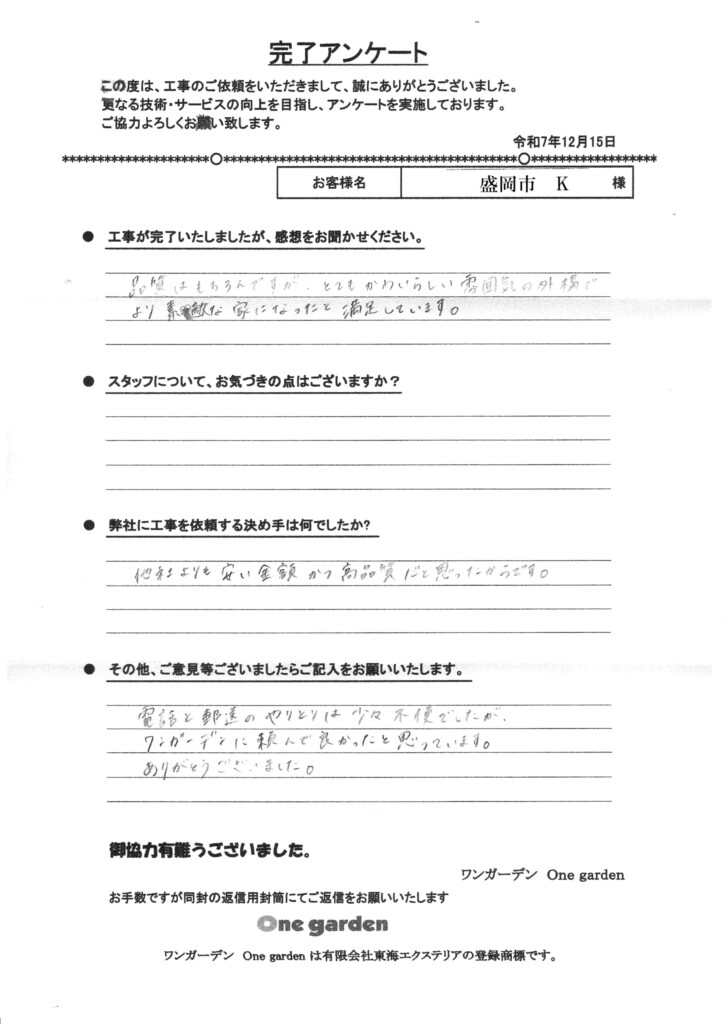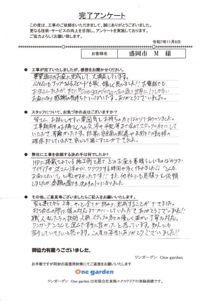 職人さんたちの技術、人柄、スタッフの方々の優しく温かい丁寧な対応、ワンガーデンさんを選んで本当に良かったと思っています。知人にも紹介していきたいと思います。この度は本当にありがとうございました!!