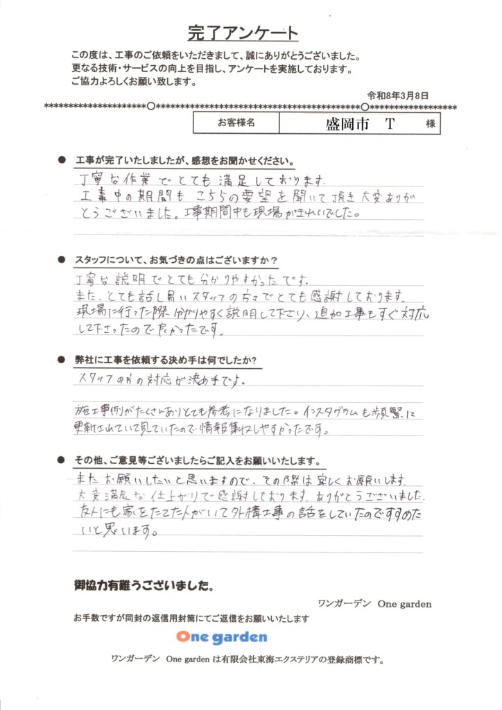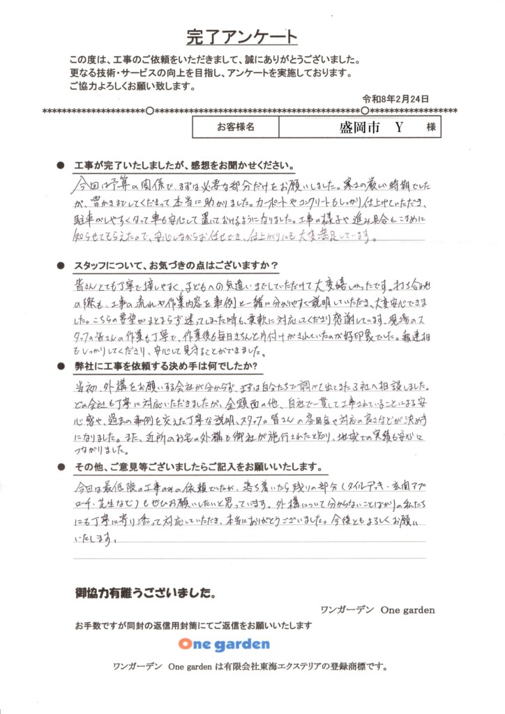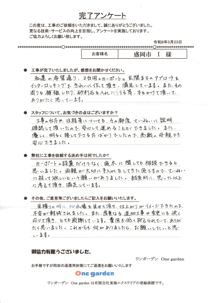 私達の希望通り、2台用のカーポートと玄関までのアプローチをインターロッキングできれいに作って頂き、満足しています。また、その周りも補強したり、砂利石を入れたりする等、手をかけて頂いて、ありがたく思っています。