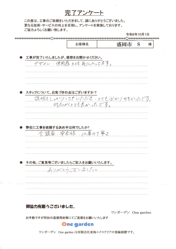 カーポートの設置だけでなく、庭木に関しても相談できると思いました。両親が大切に手入れしてきた庭ですので、ていねいに扱って欲しいという願いがありました。結果的に、思った以上に考えて頂き、満足しています。