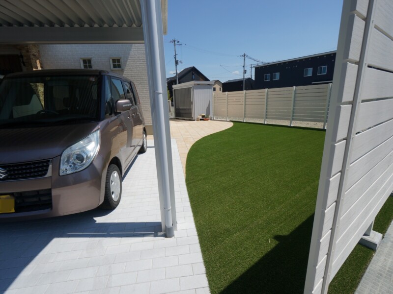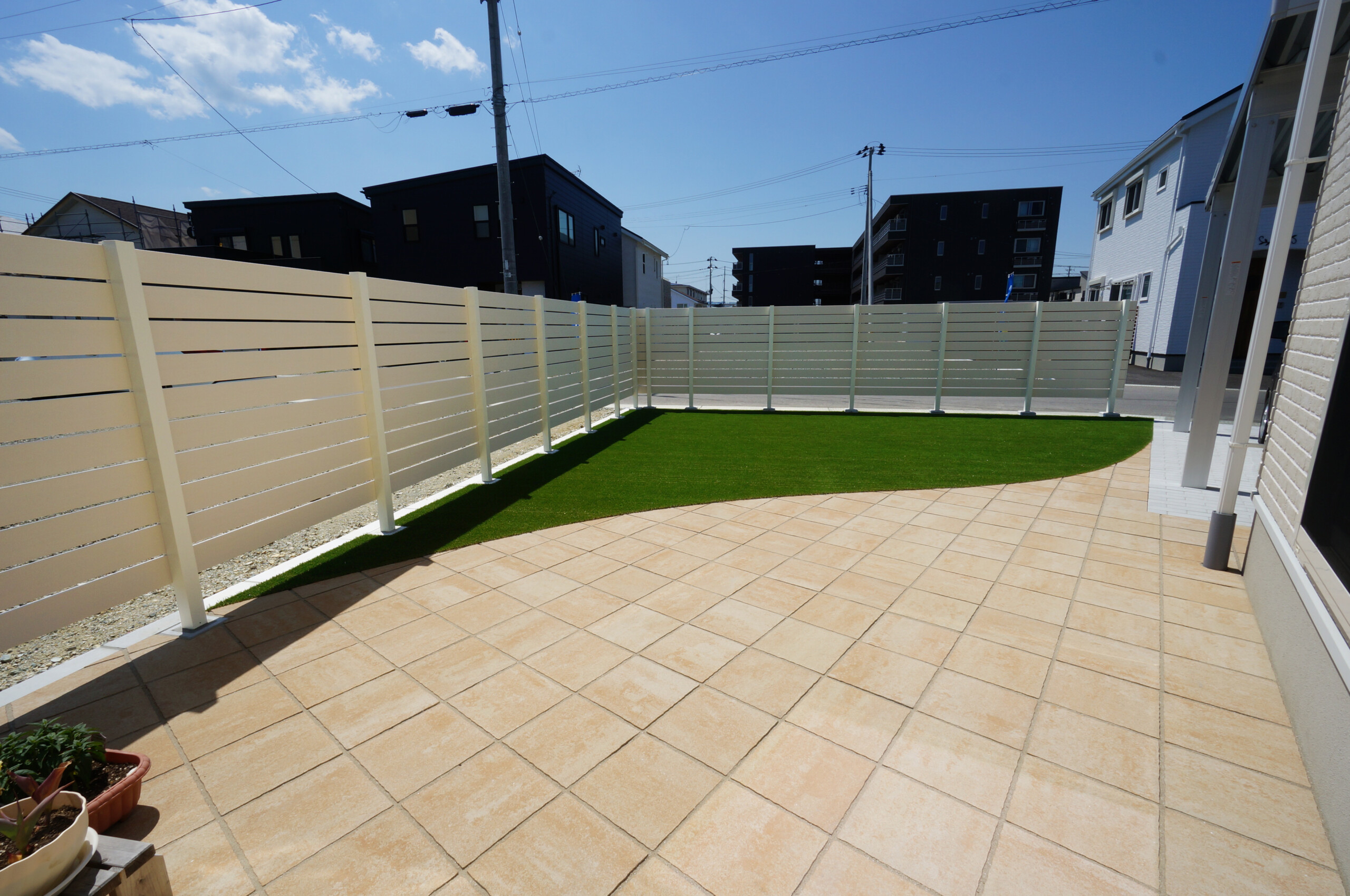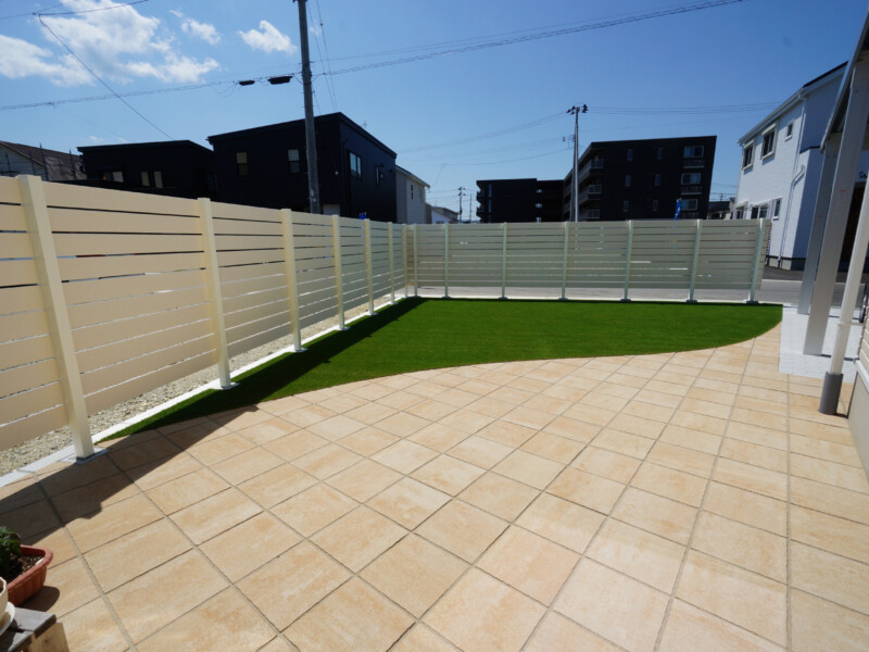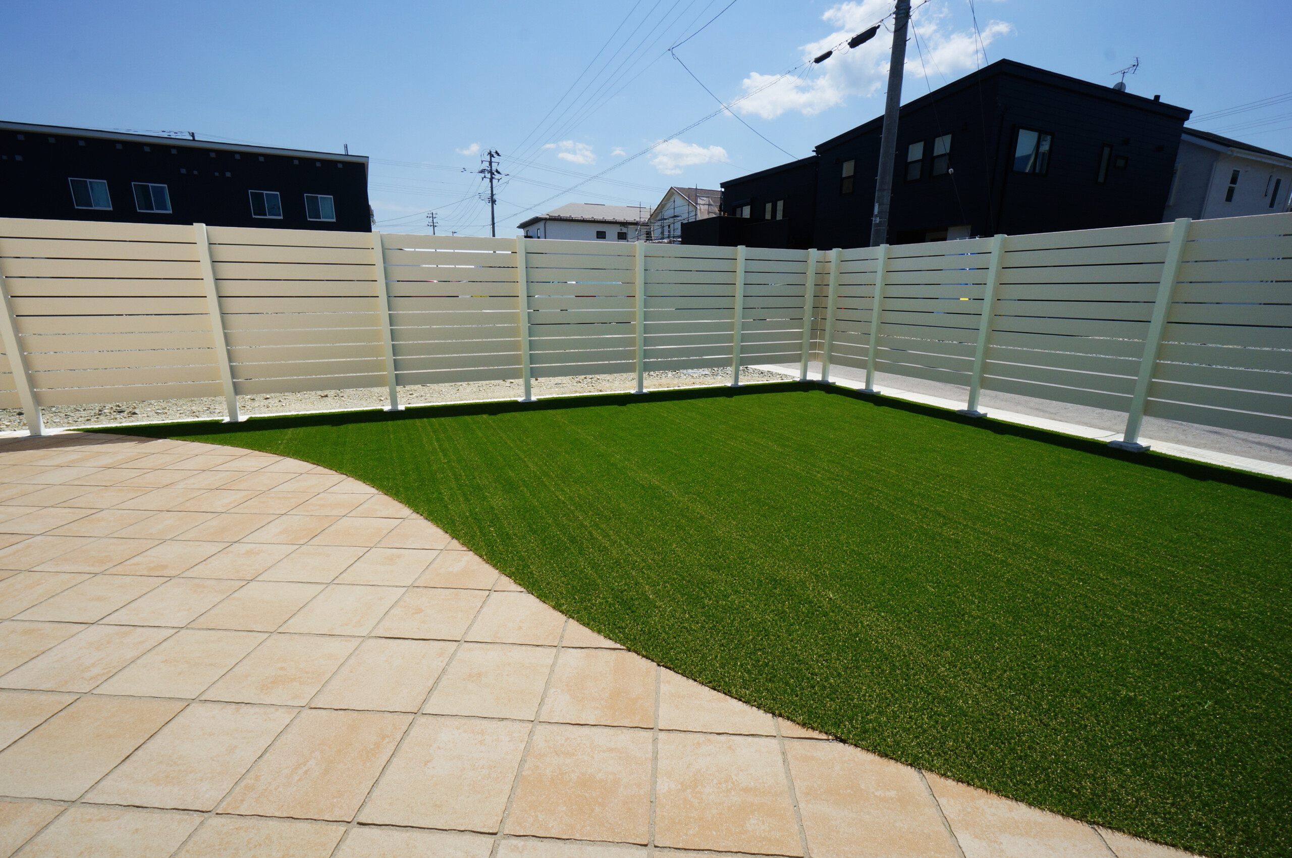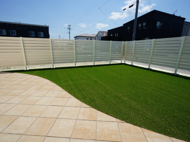 人工芝とインターロッキングをダイナミックな曲線で区切り開放感のある庭に。
