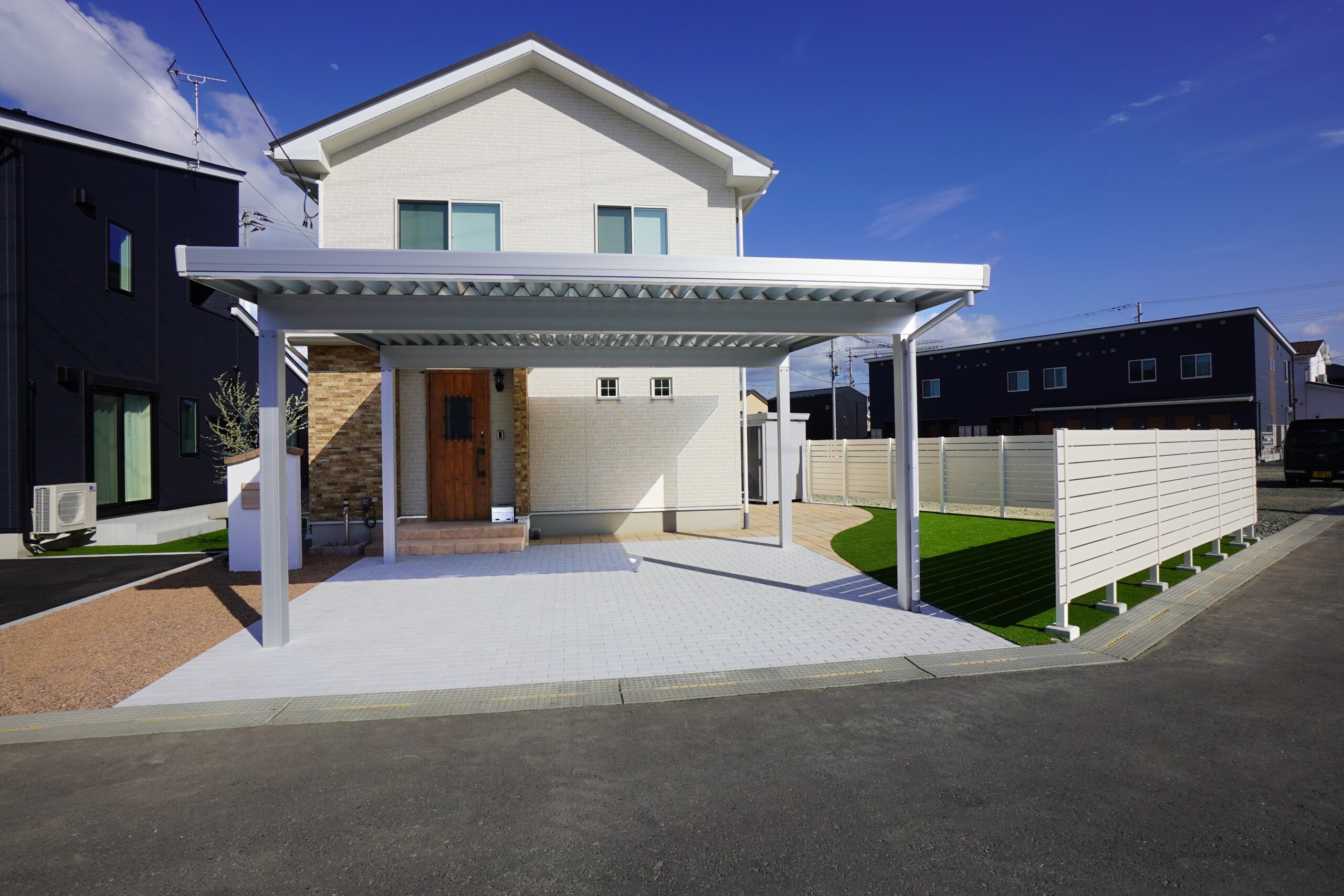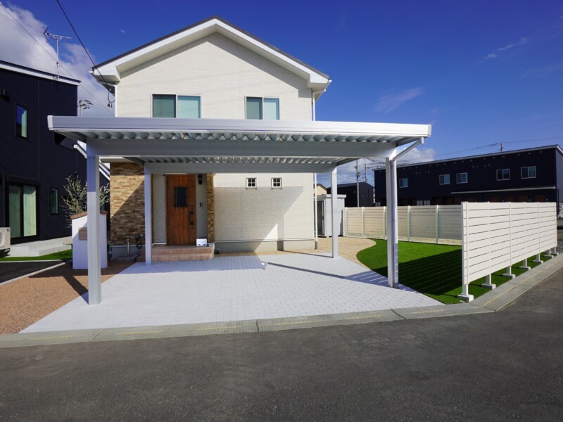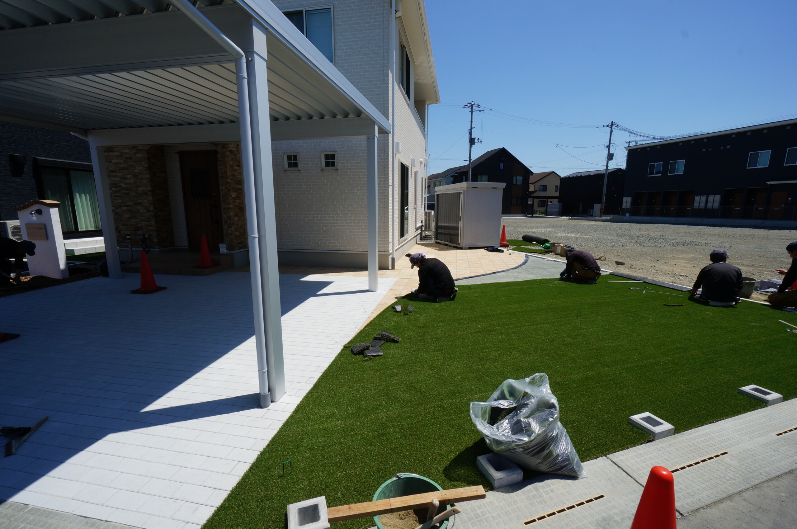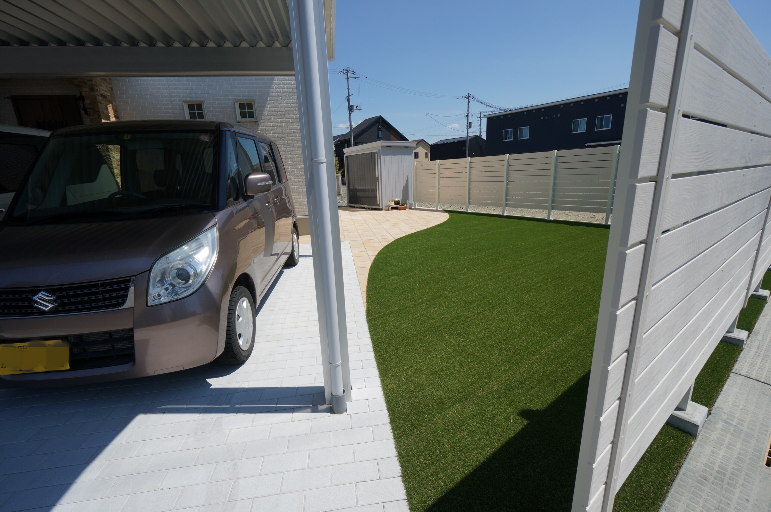 人工芝とインターロッキングをダイナミックな曲線で区切り開放感のある庭に。