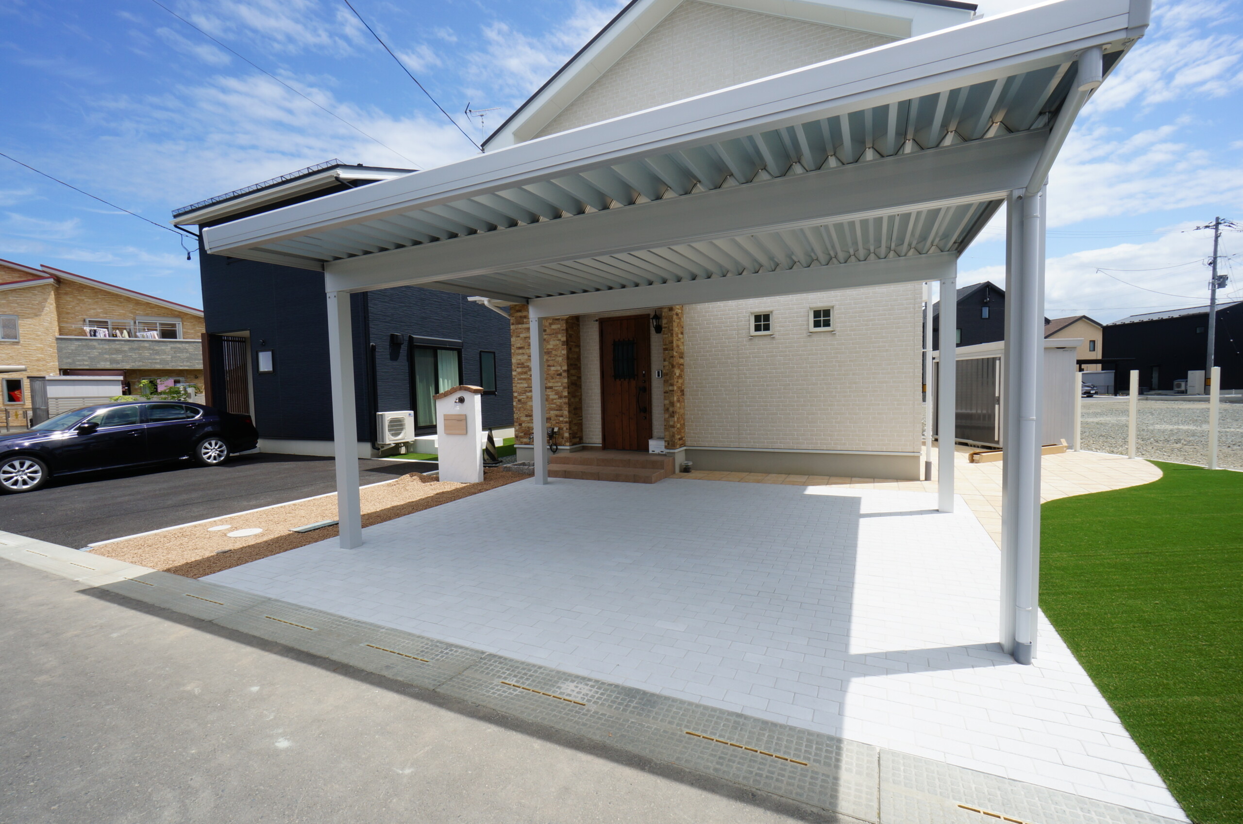 駐車スペースは透水性のインターロッキングで勾配がとれなくても水が溜まらないように。