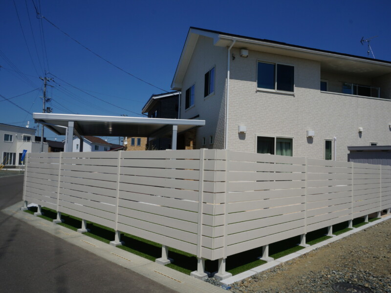 人工木のフェンスが爽やかに目隠しをして庭で気持ちよく遊べるようになりました。