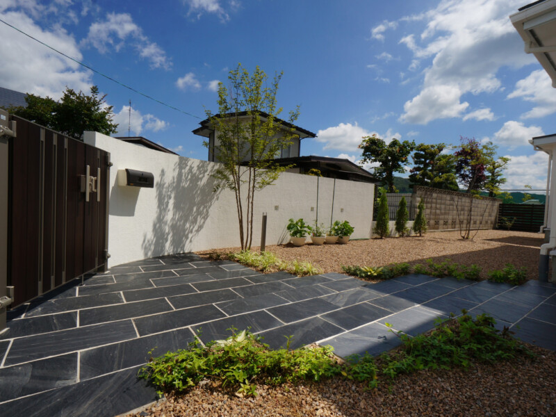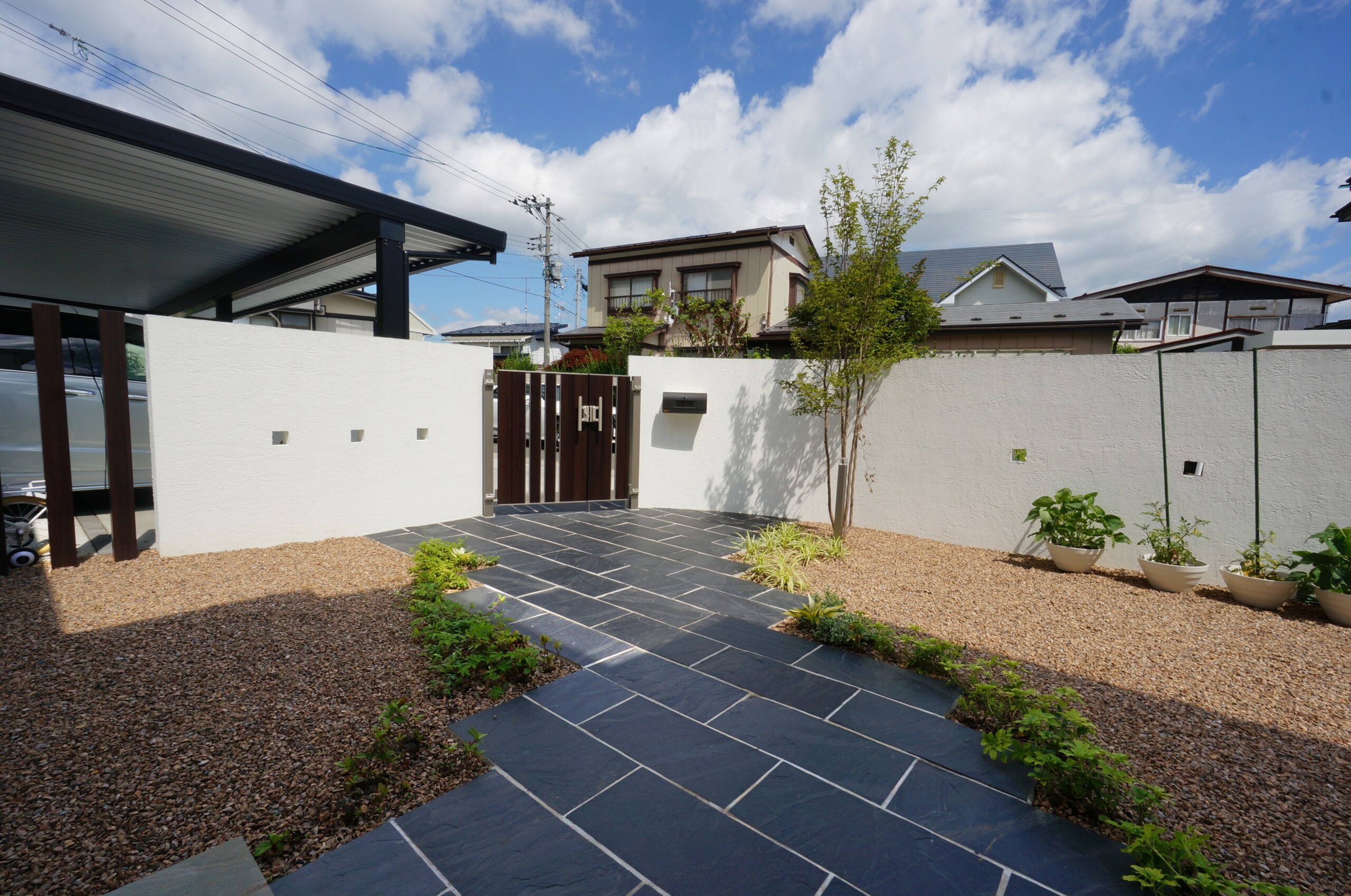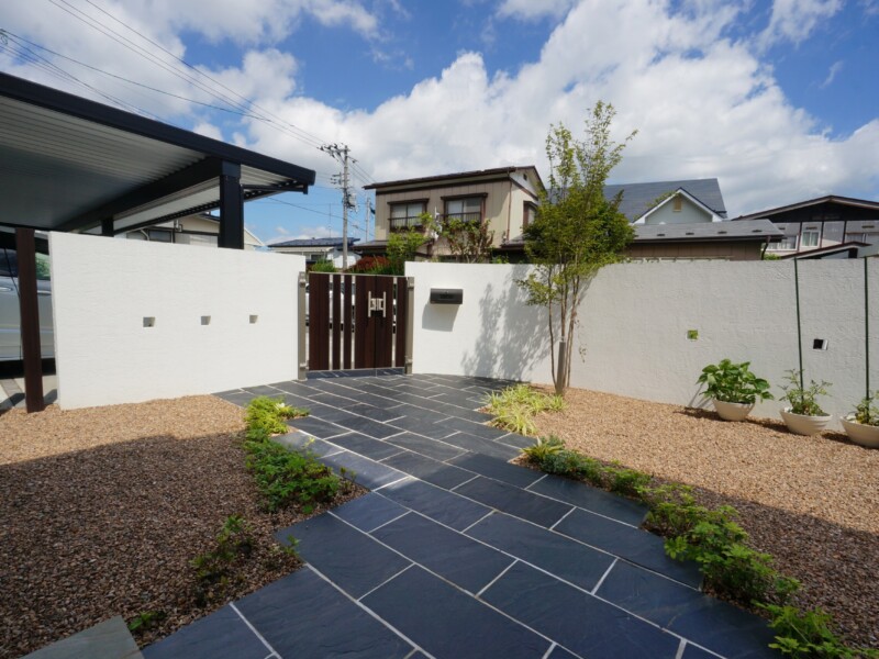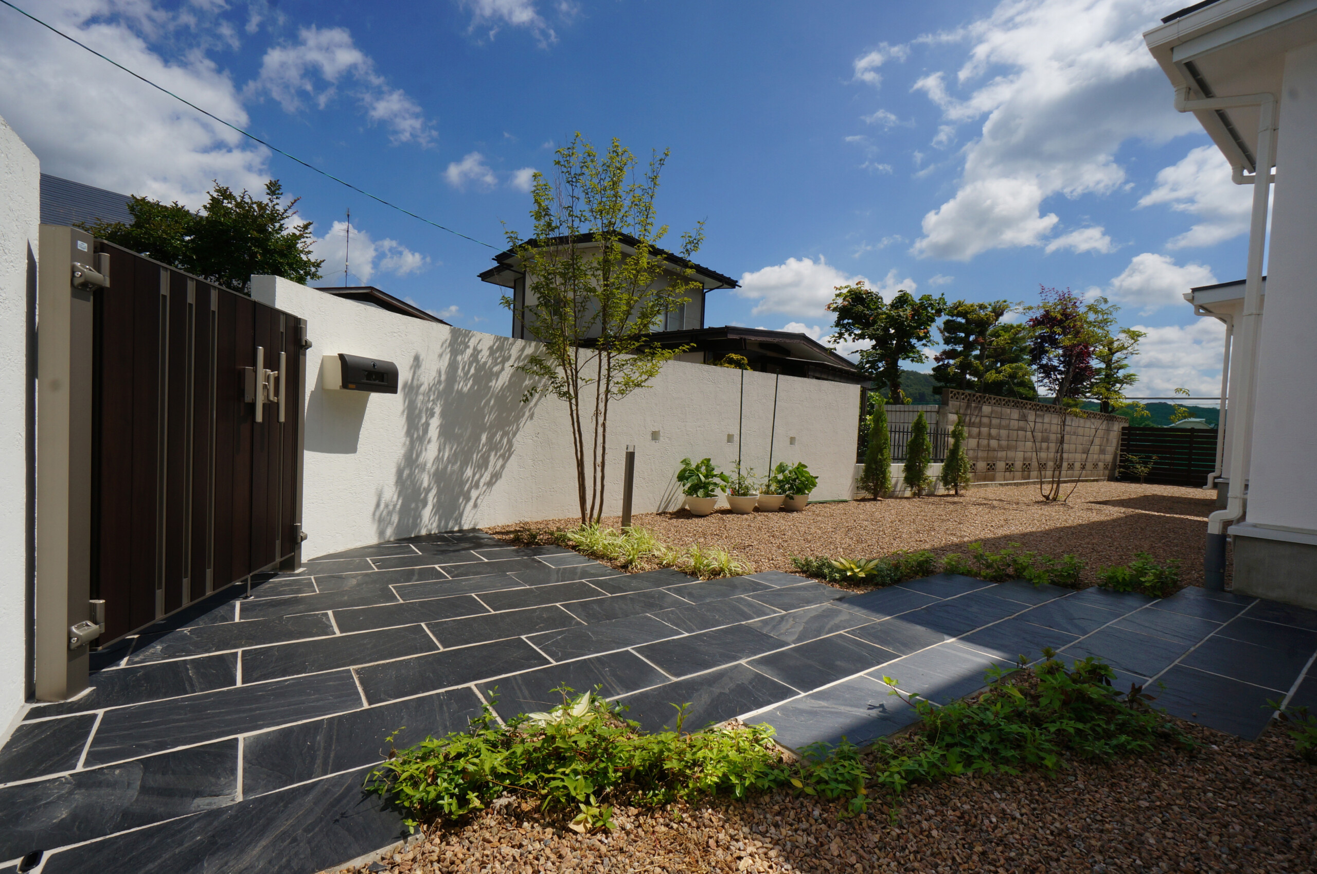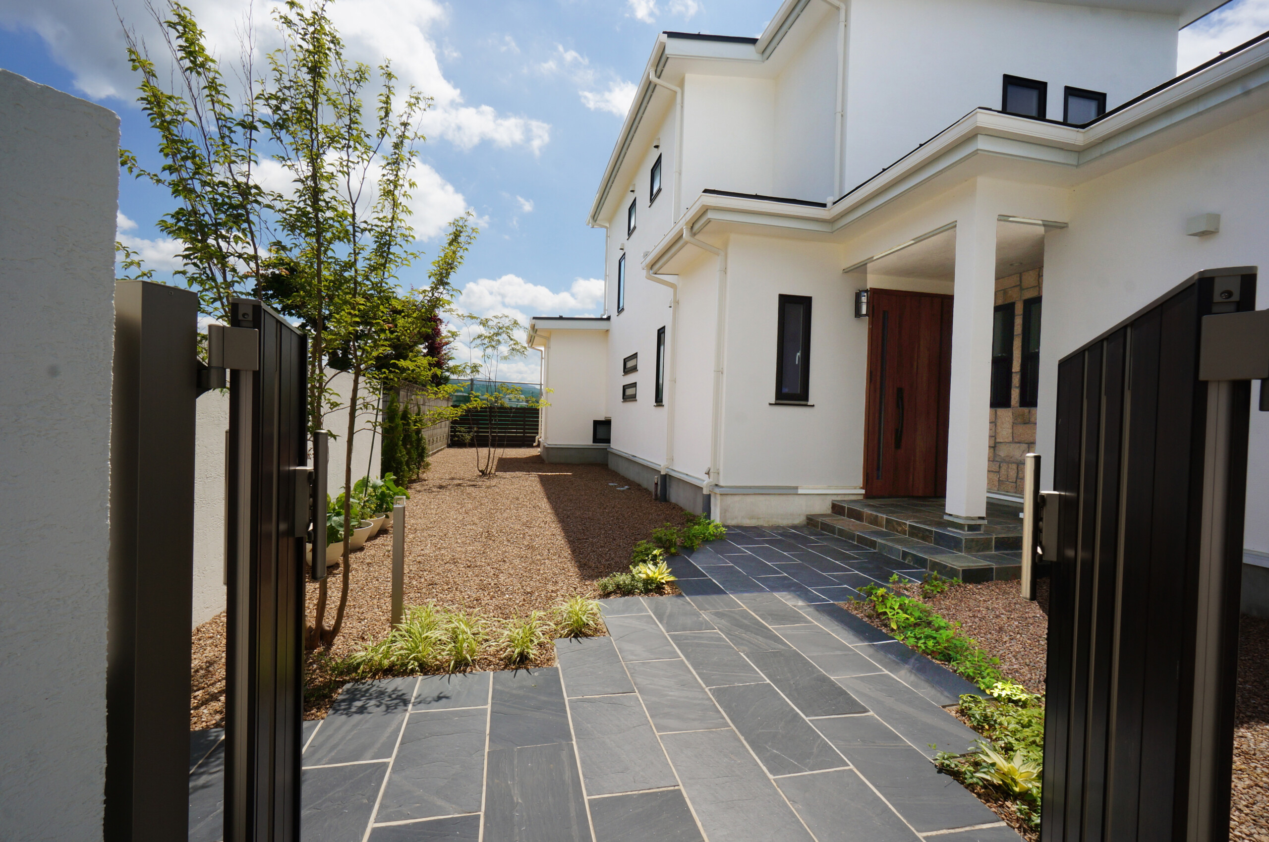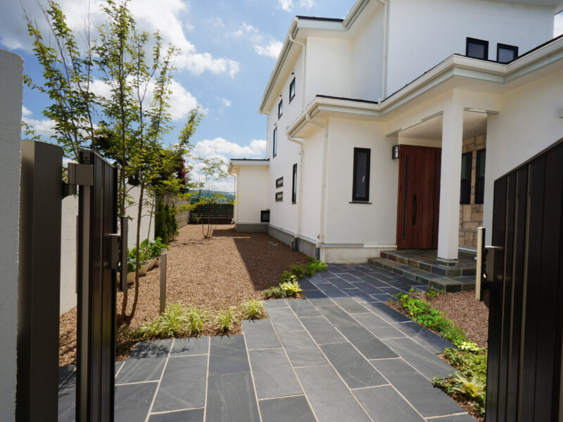 白い壁とアクセントカラーの木目の門扉や枕木が引き締めています。アプローチの自然石も重厚な感じで