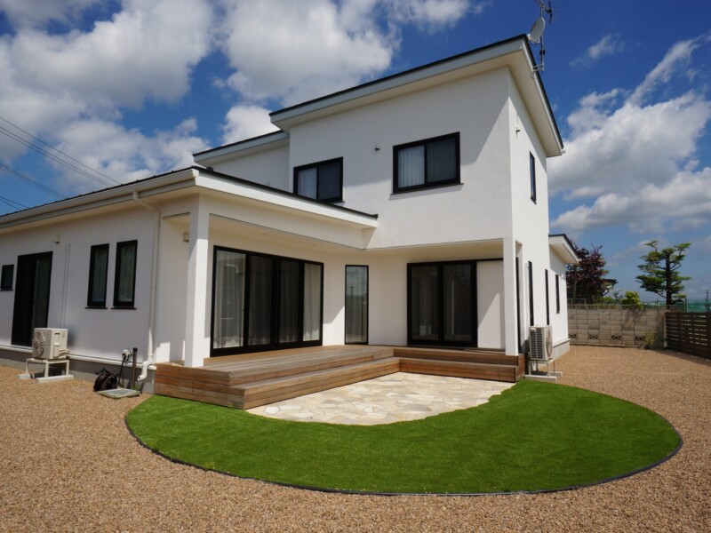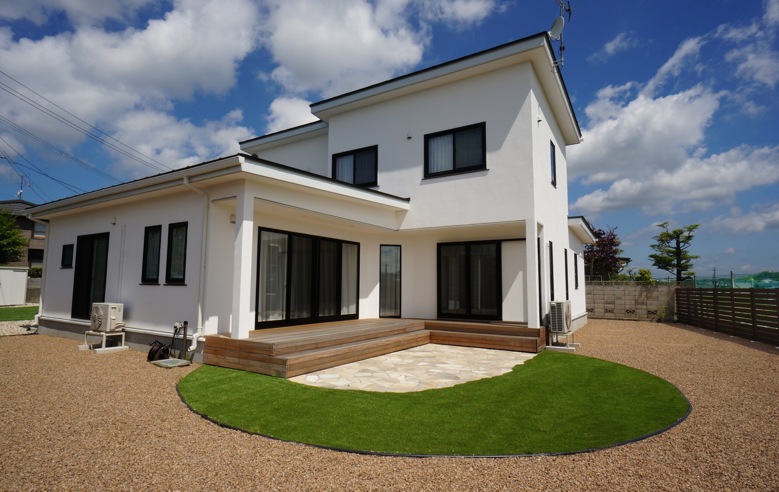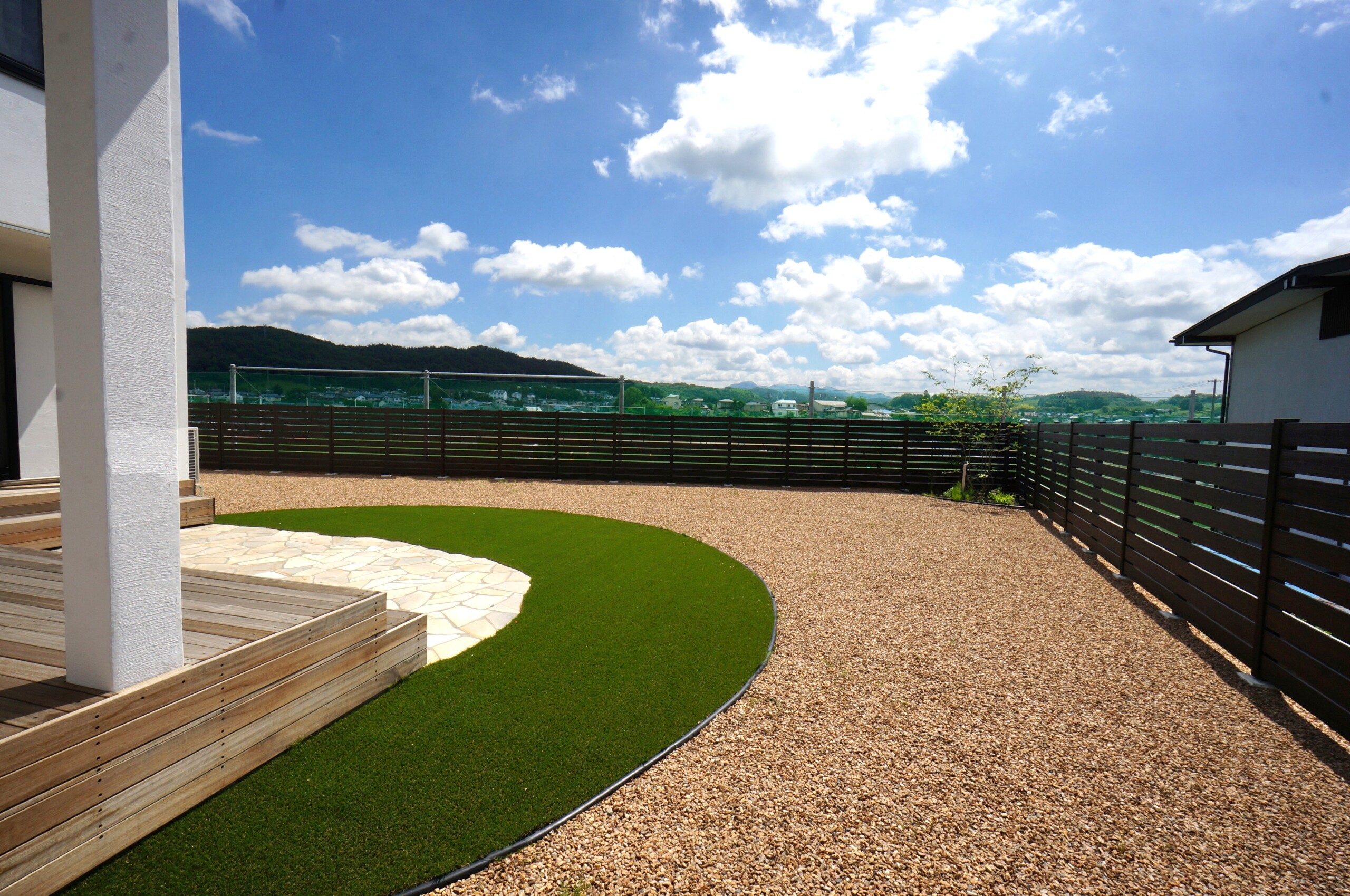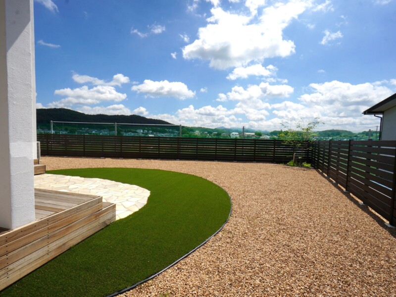 玄関前とは打って変わって開放感に溢れた庭は自然石のテラスと人工芝で楽しめます。
