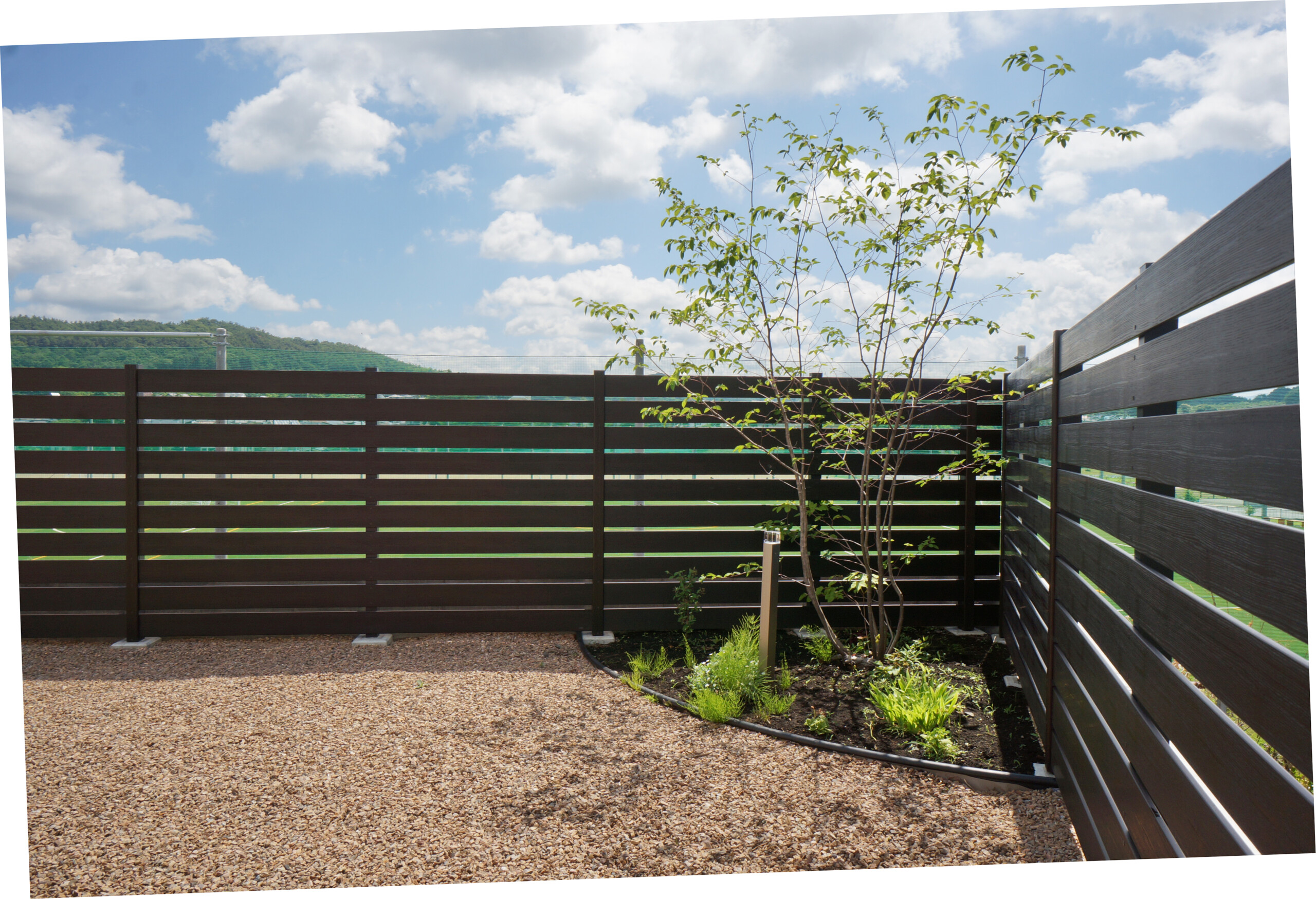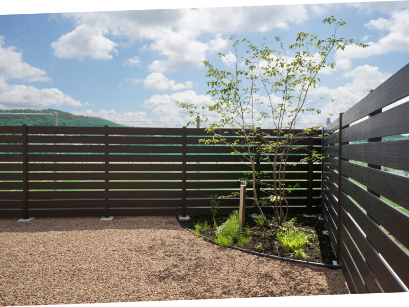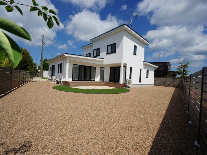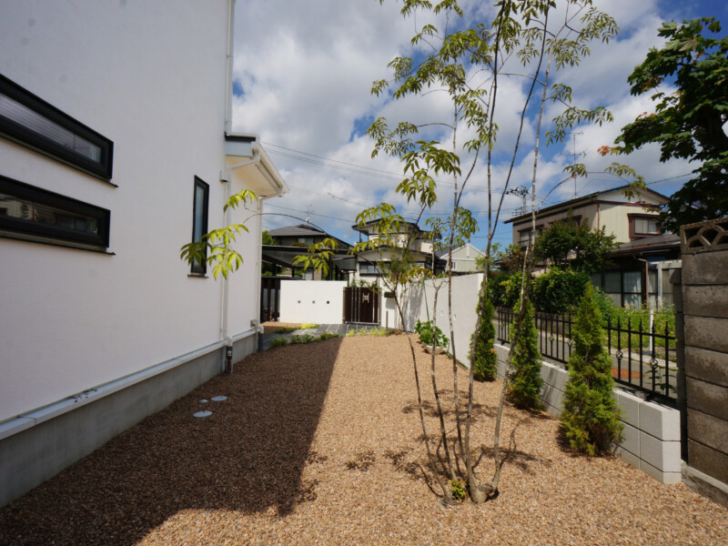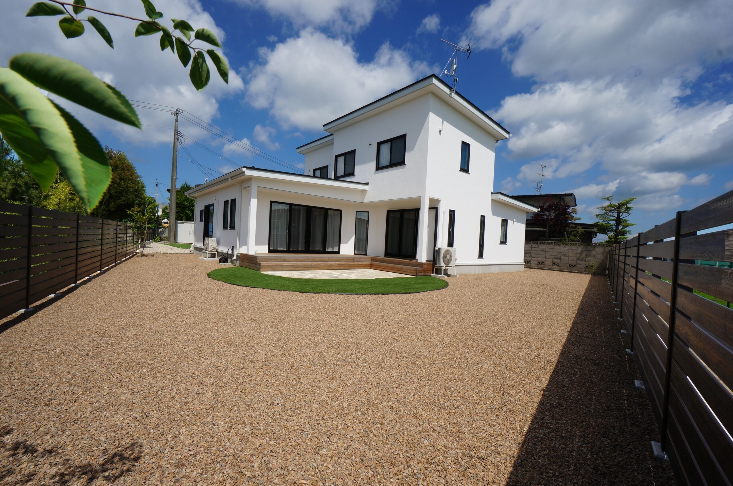 玄関前とは打って変わって開放感に溢れた庭は自然石のテラスと人工芝で楽しめます。