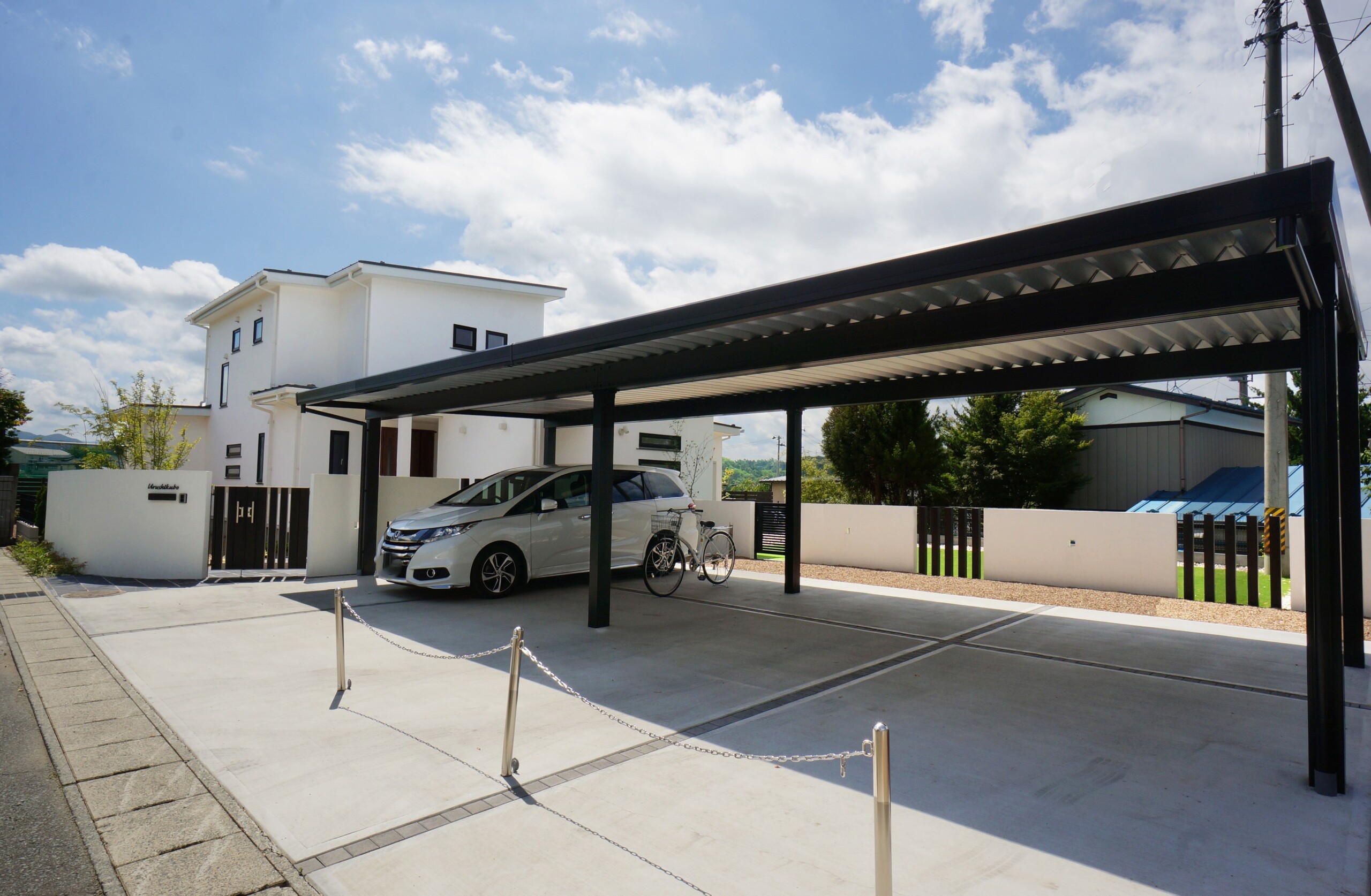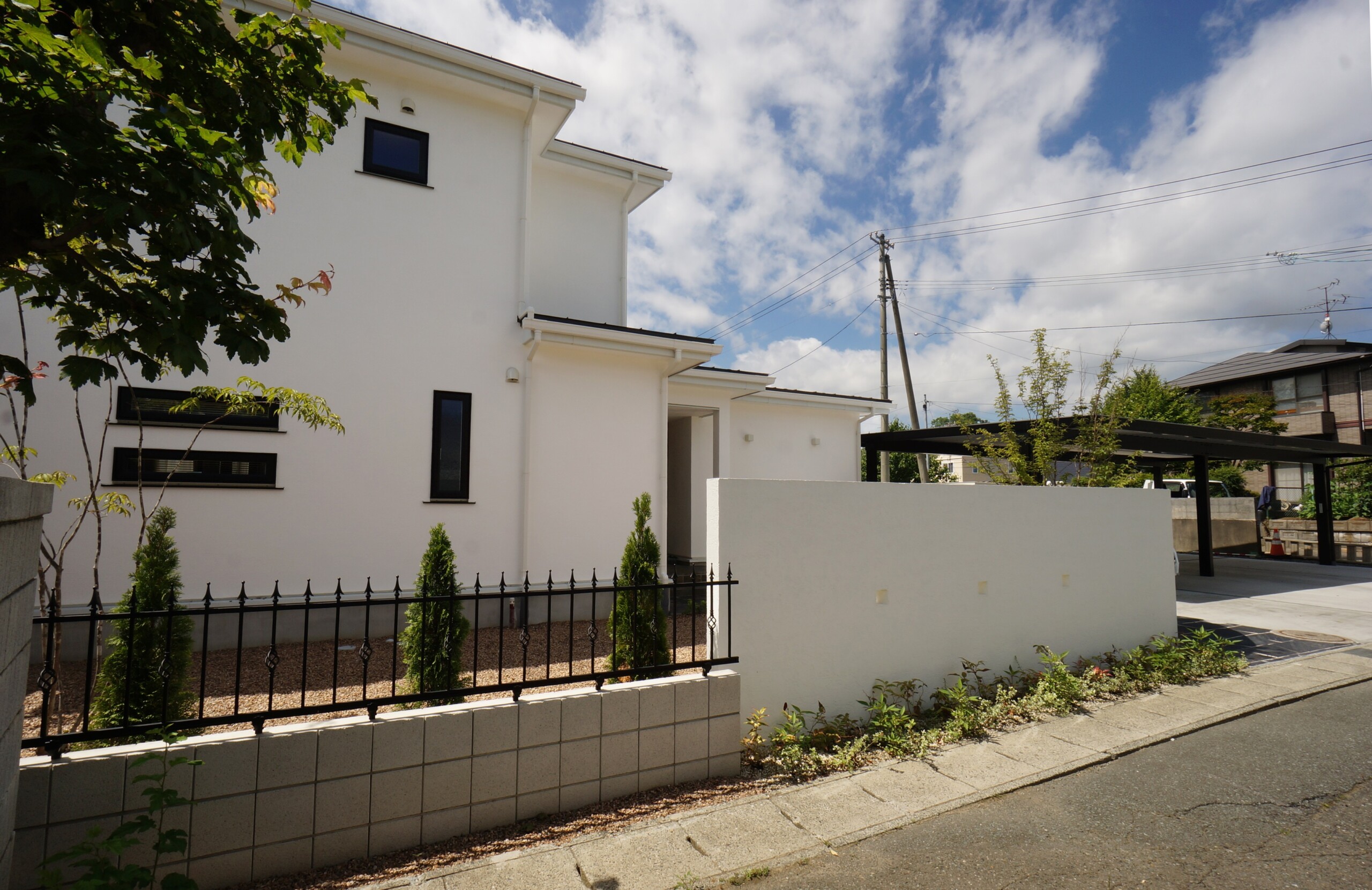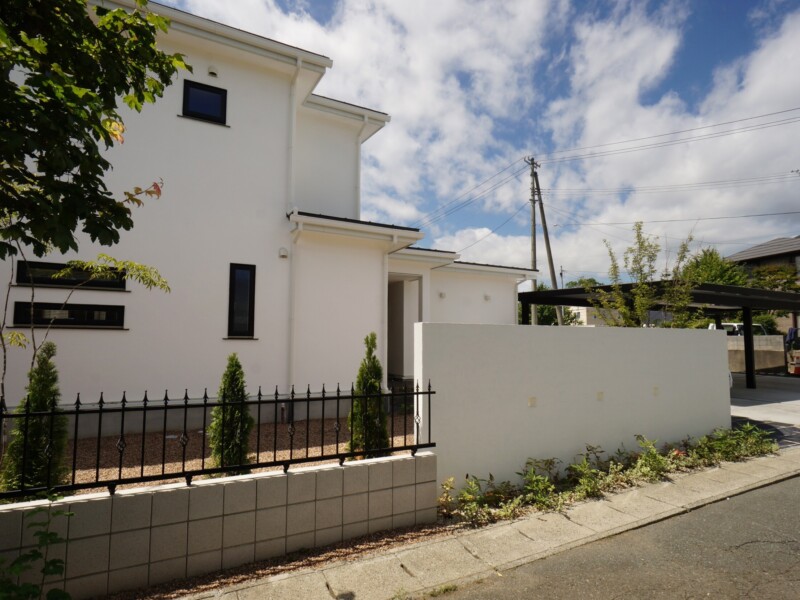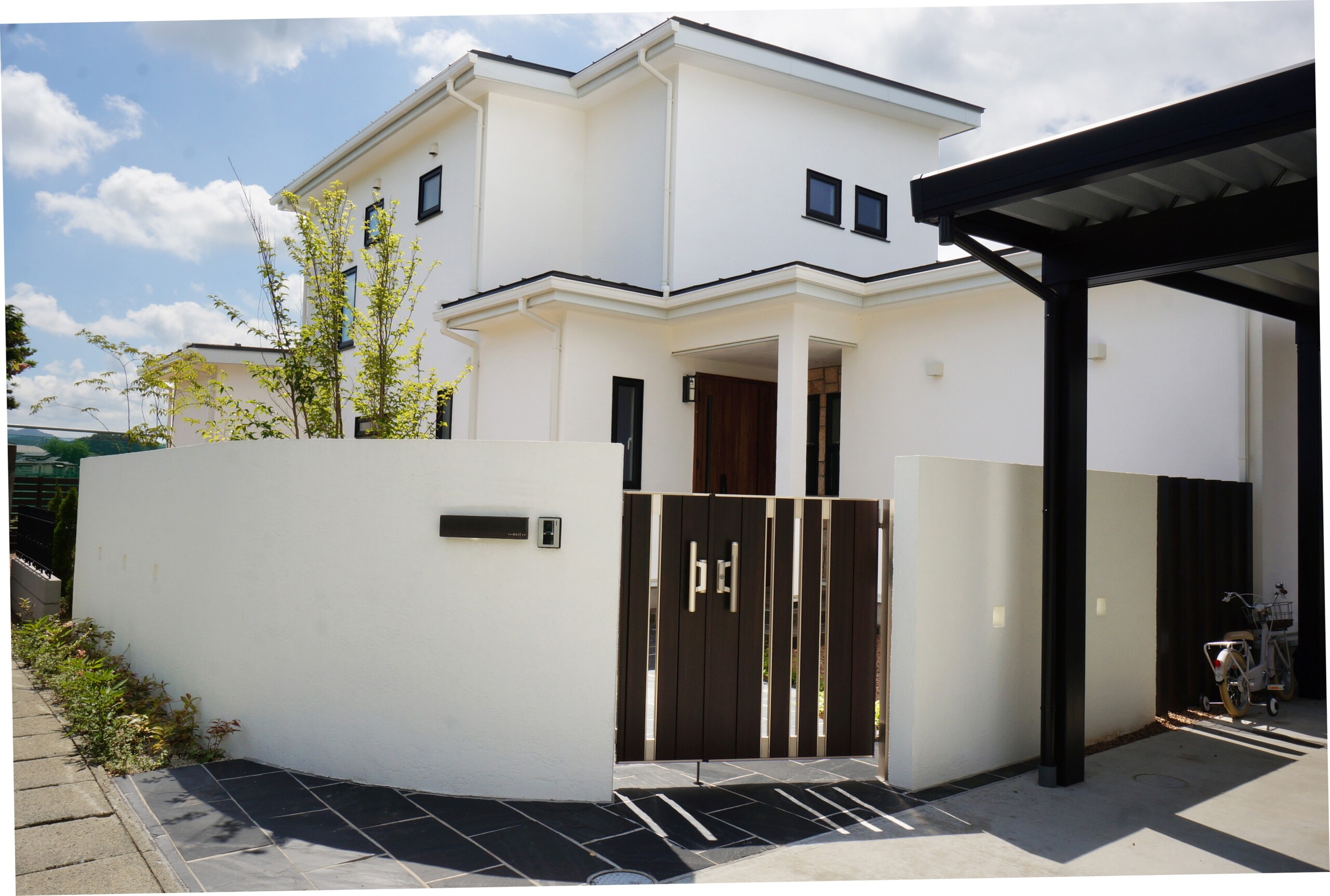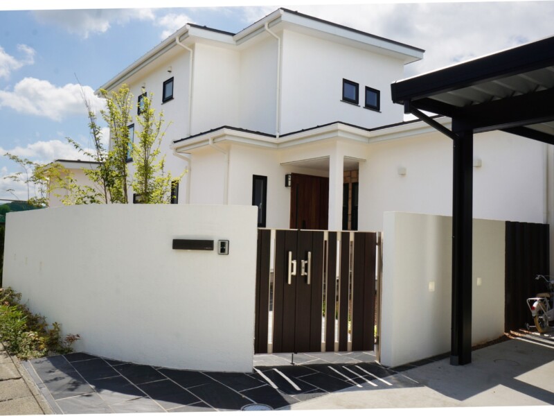 白壁が美しく印象的な家の外観が引き立つように、あまり主張せず、でも印象に残るような門構え。