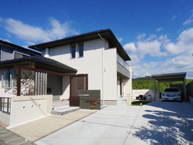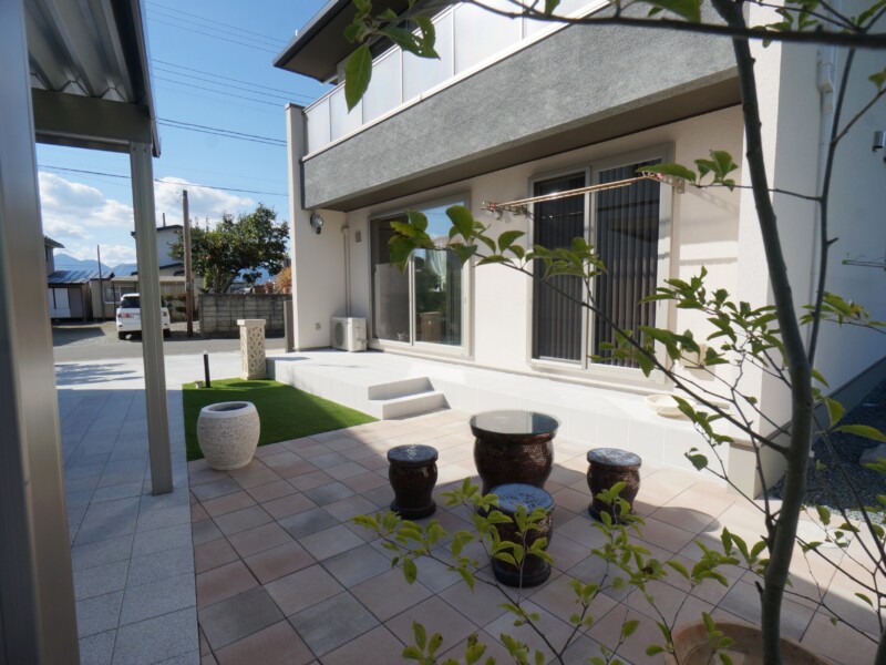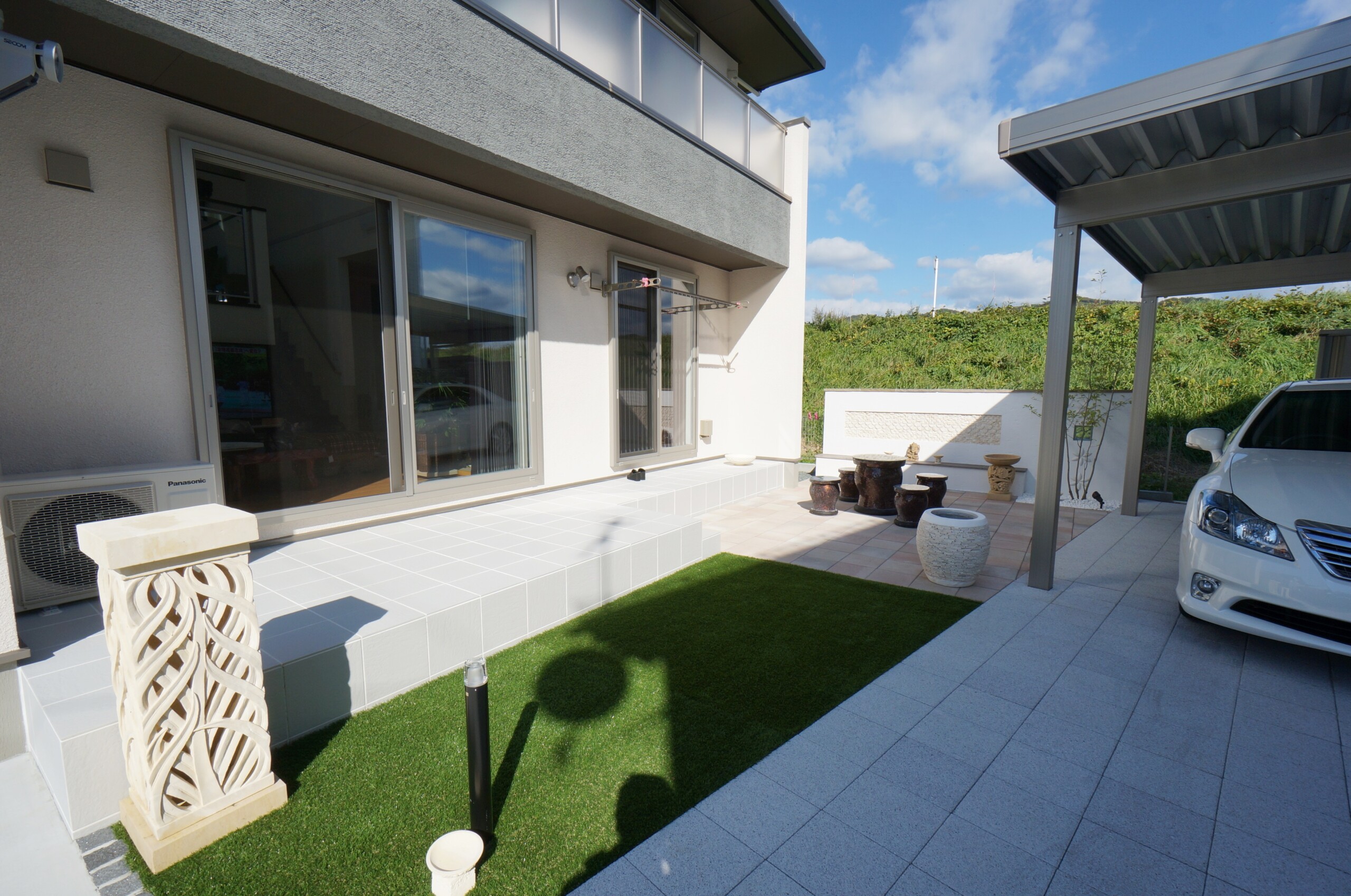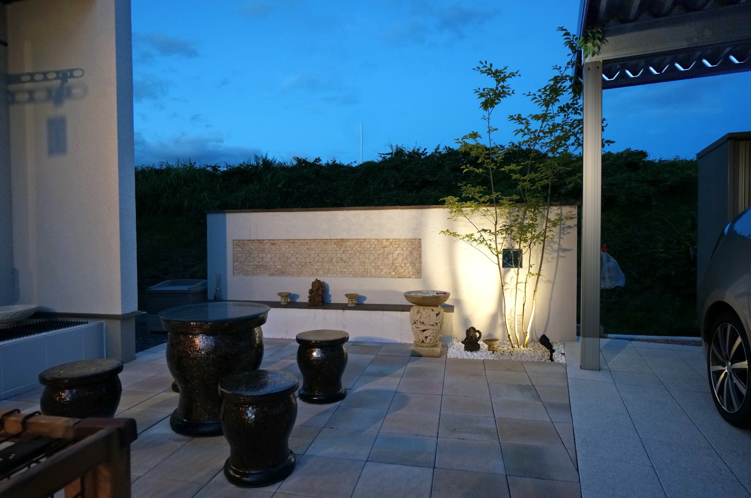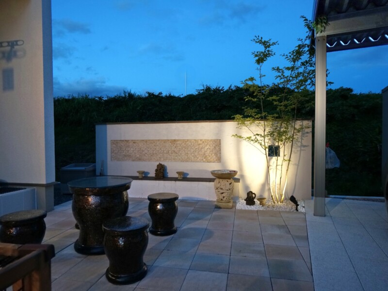 お庭はF様こだわりのバリ風をイメージしたリゾートガーデンです。あたたかみのある色合いの平板で明るい印象のテラスに、人工芝の緑がよく合います。サンゴ石灰岩のタイルを貼ったデザインウオール(飾り壁)には、オブジェを置けるように台を設けました。Fさんセレクトのすてきなオブジェが華やかに彩り、リゾート風のプライベートガーデンを演出しています。
