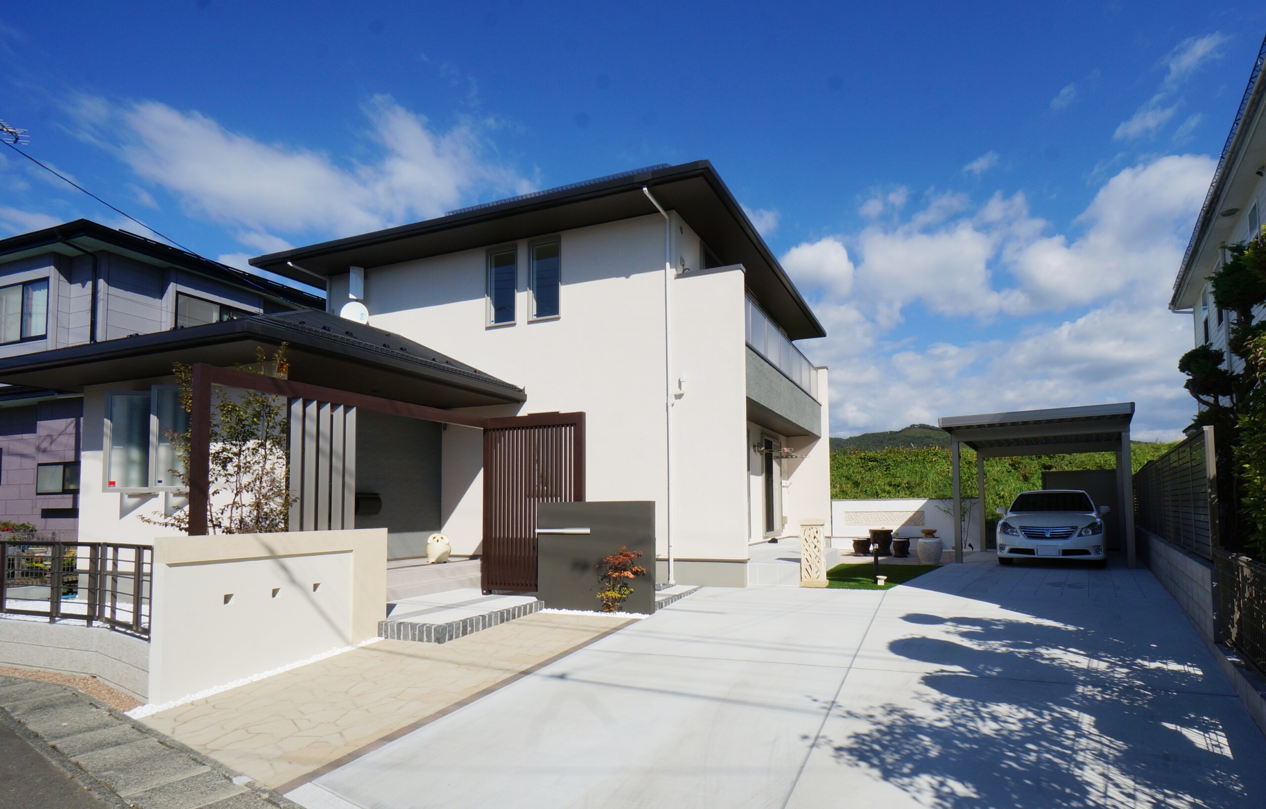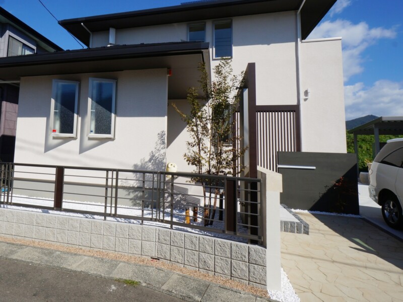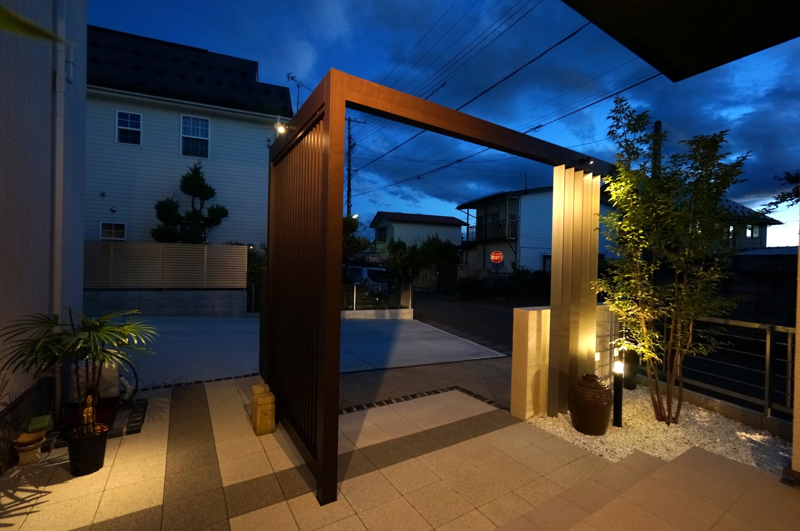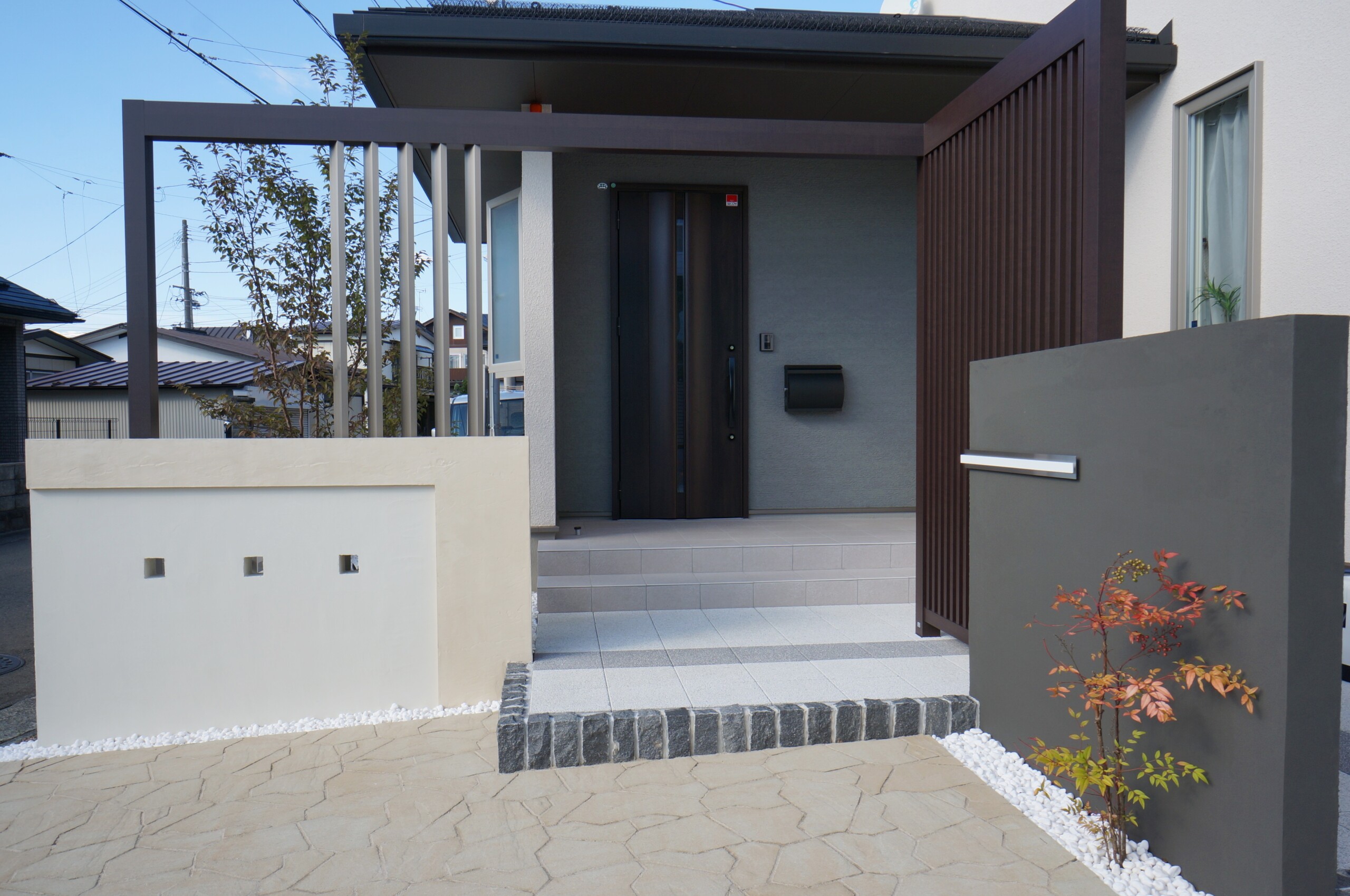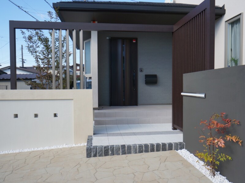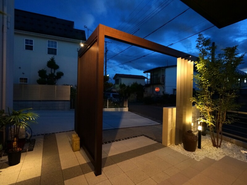 特注の二つの門袖と、それをつなぐように柿渋色のフレームと縦格子スクリーンで、個性的な