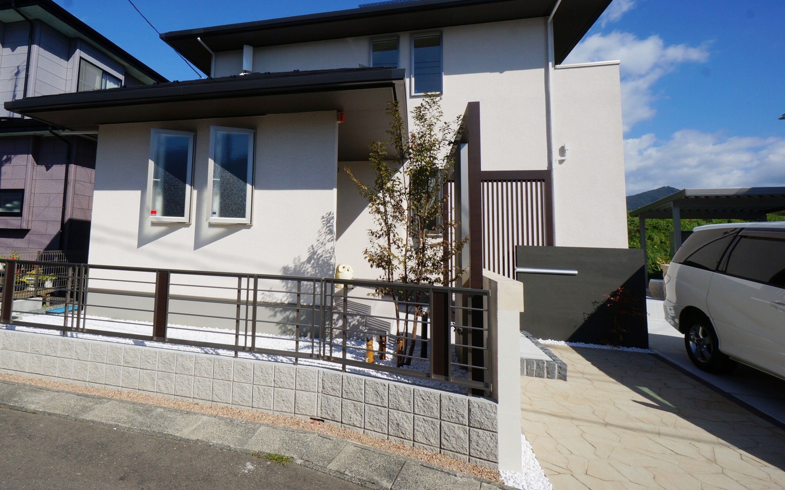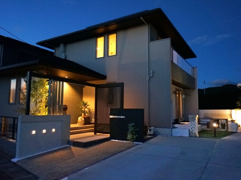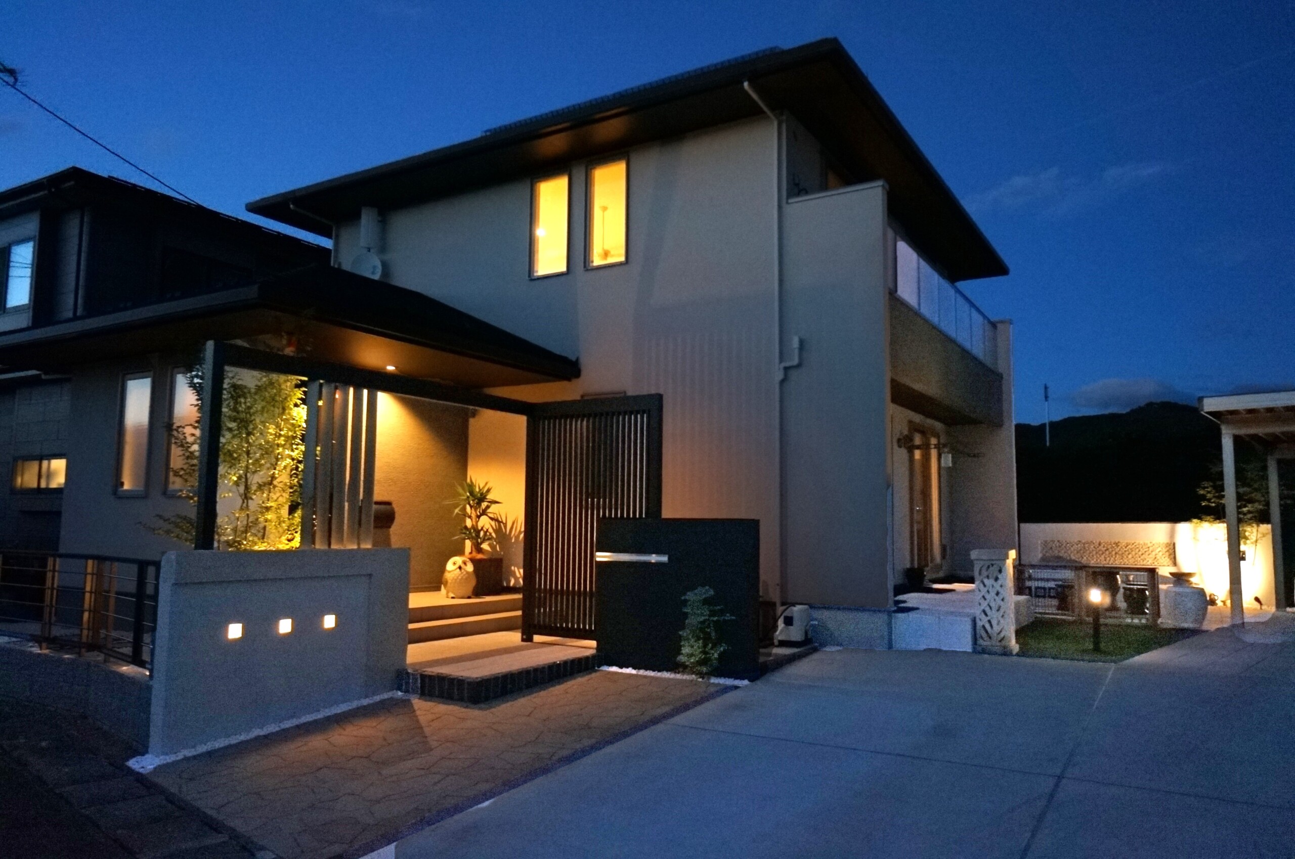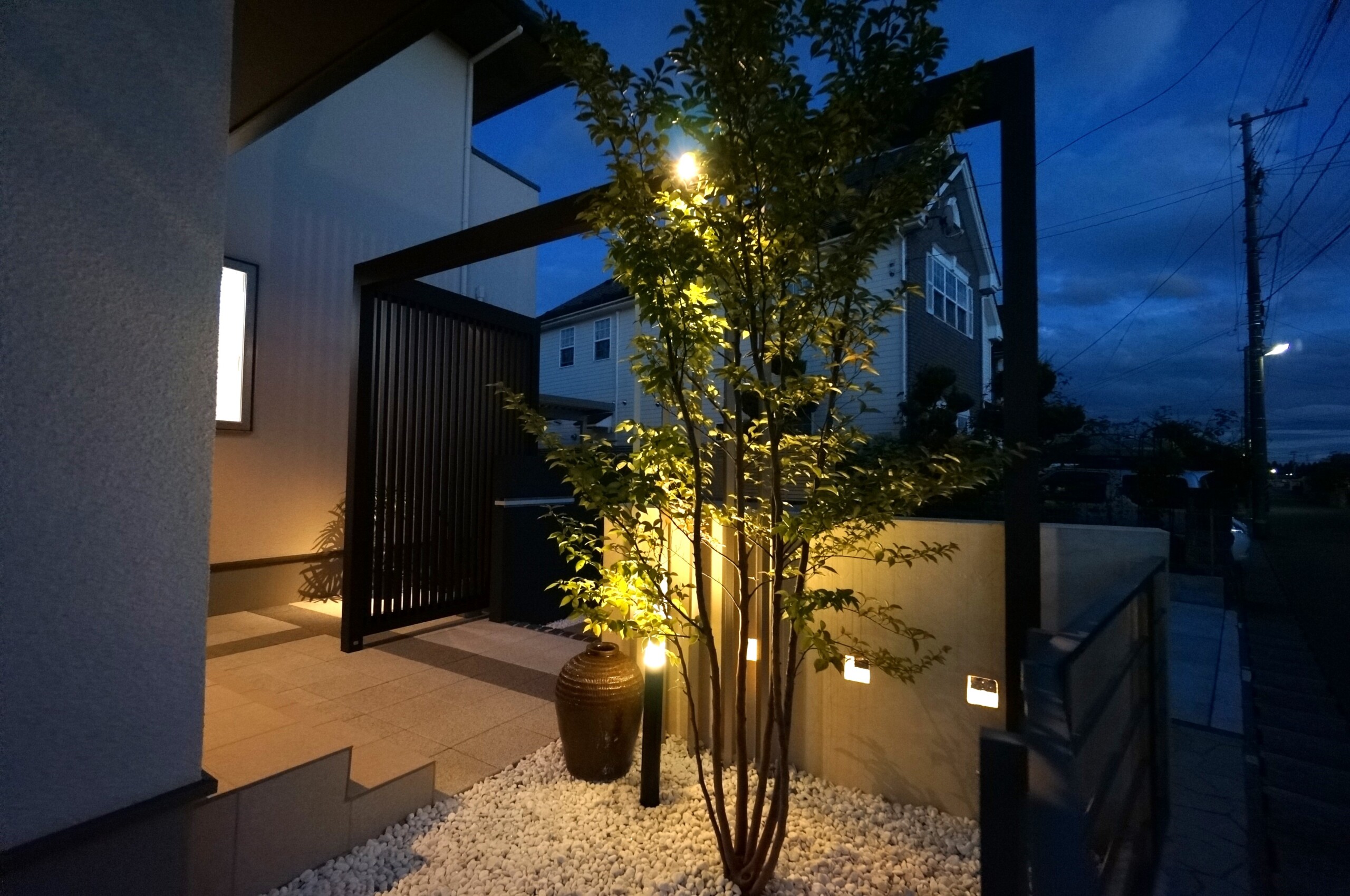特注の二つの門袖と、それをつなぐように柿渋色のフレームと縦格子スクリーンで、個性的な